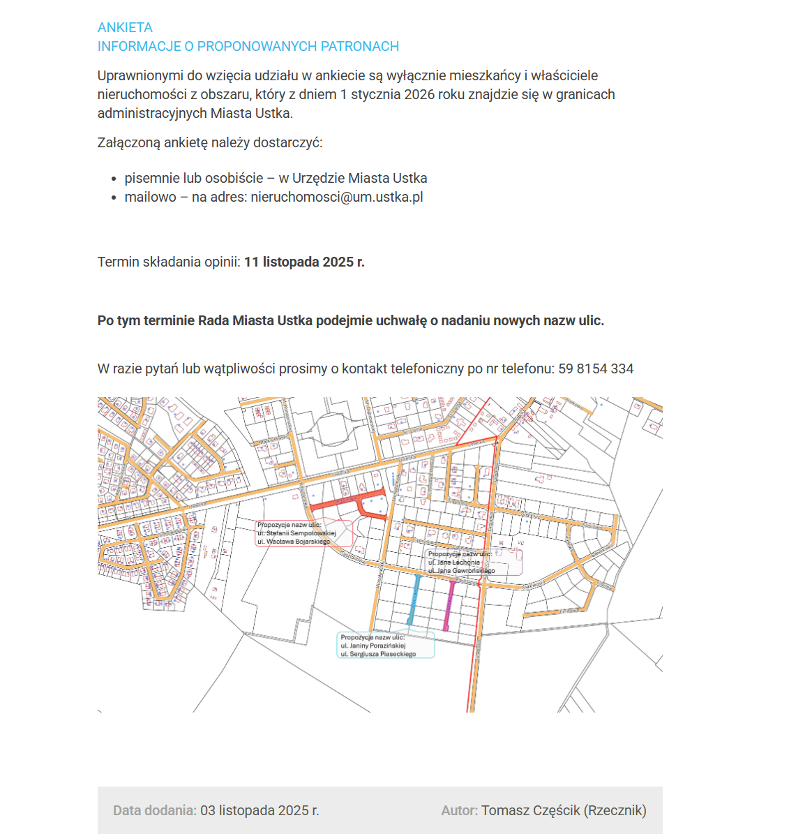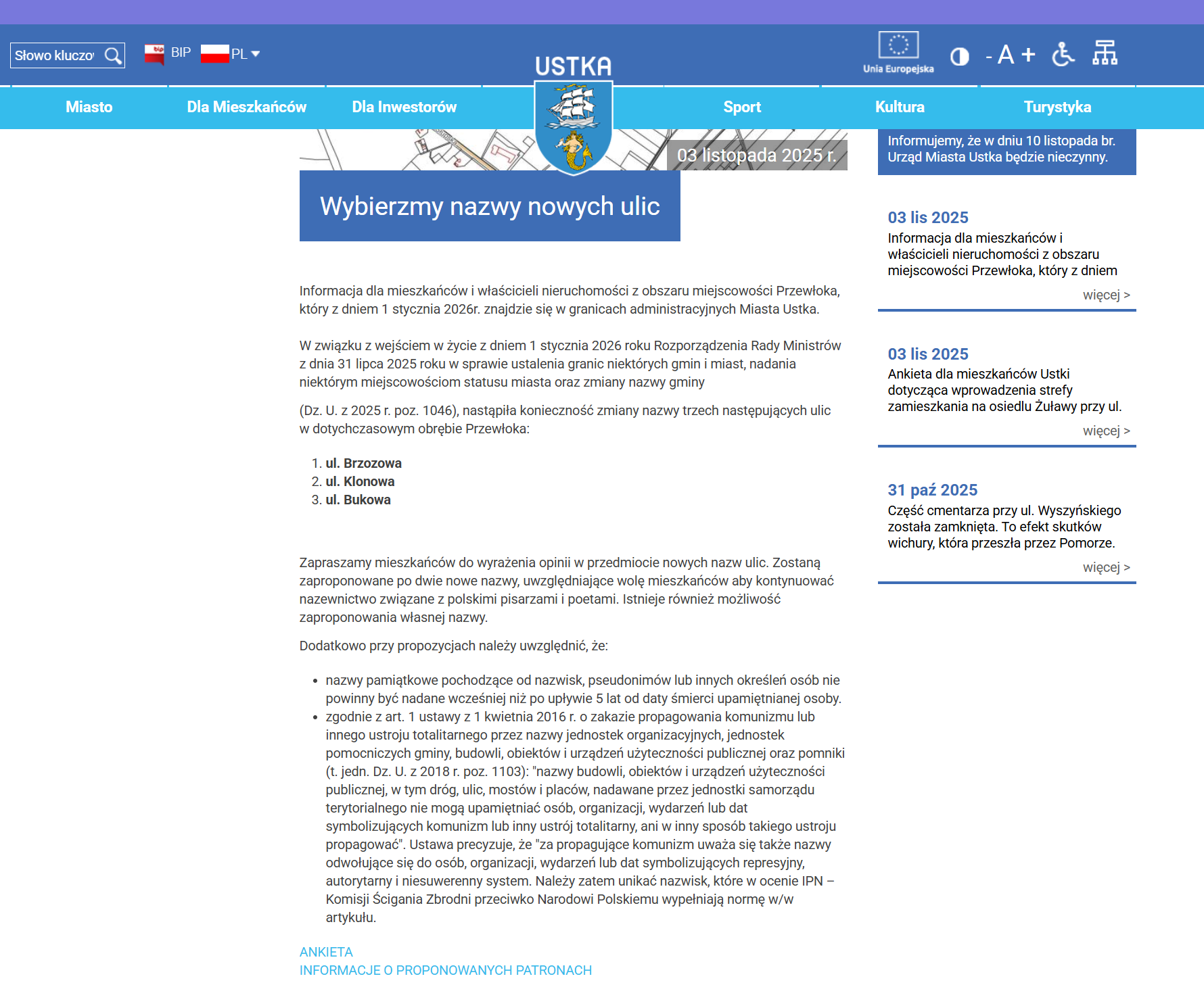 Informacja o ankiecie: Wybierzmy nazwy nowych ulic – Aktualności – Ustka – Oficjalna strona miasta