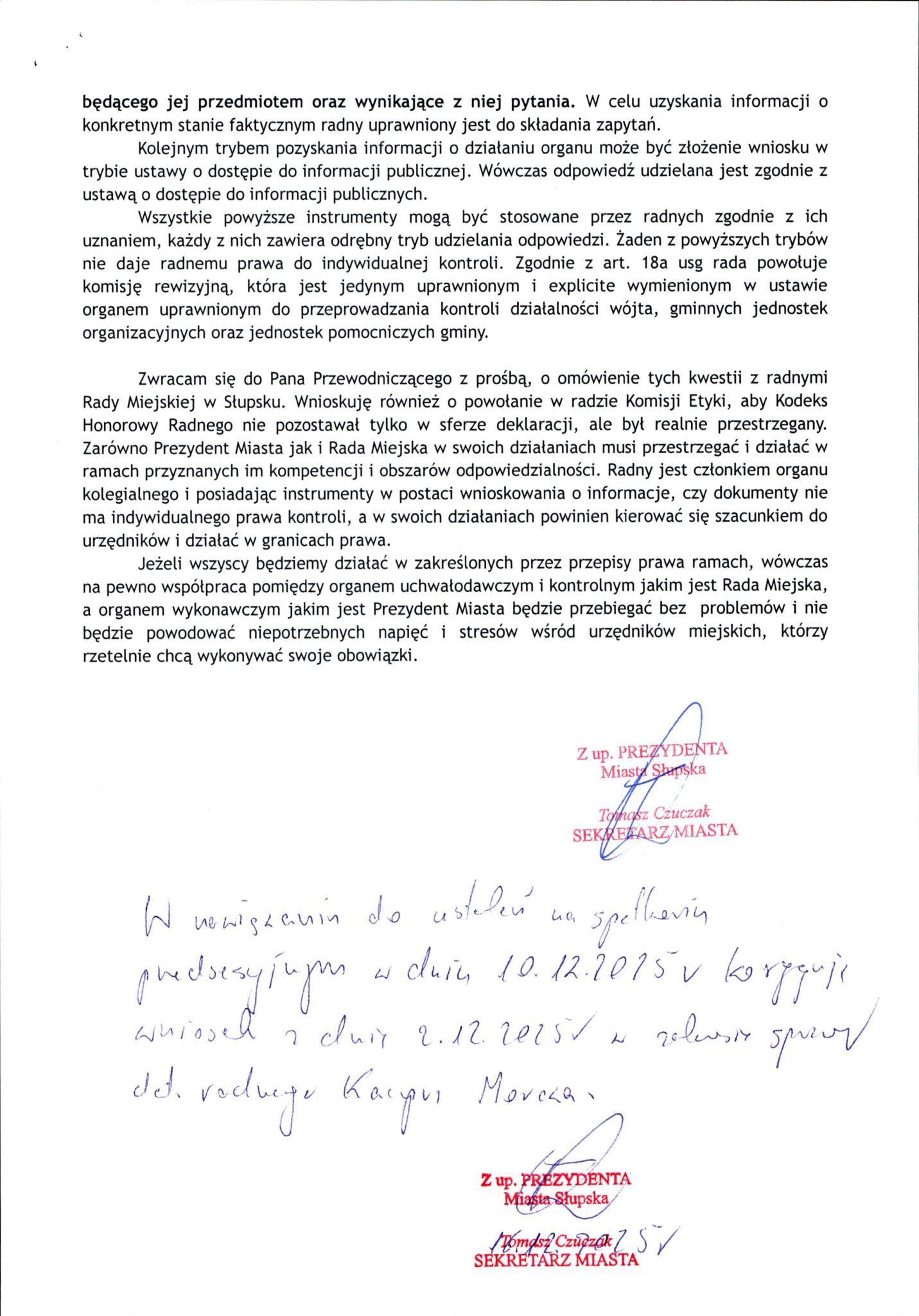 ani razu nie używa słowa „skarga”, trudno oprzeć się wrażeniu, że dokładnie z tym mamy do czynienia: z urzędniczą skargą na radnych, którzy – zdaniem sekretarza – przekroczyli granice etyki w kontaktach z pracownikami urzędu.