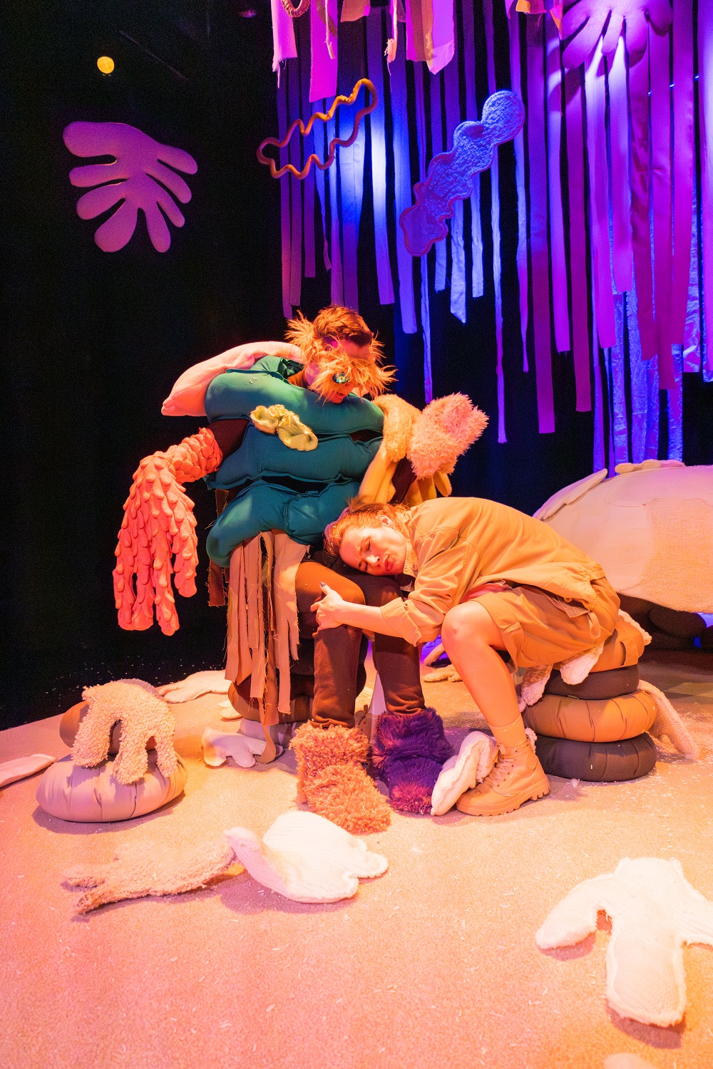Scenografia spektaklu jest niemal wyłącznie miękka i bezpieczna – poduszki, rekwizyty