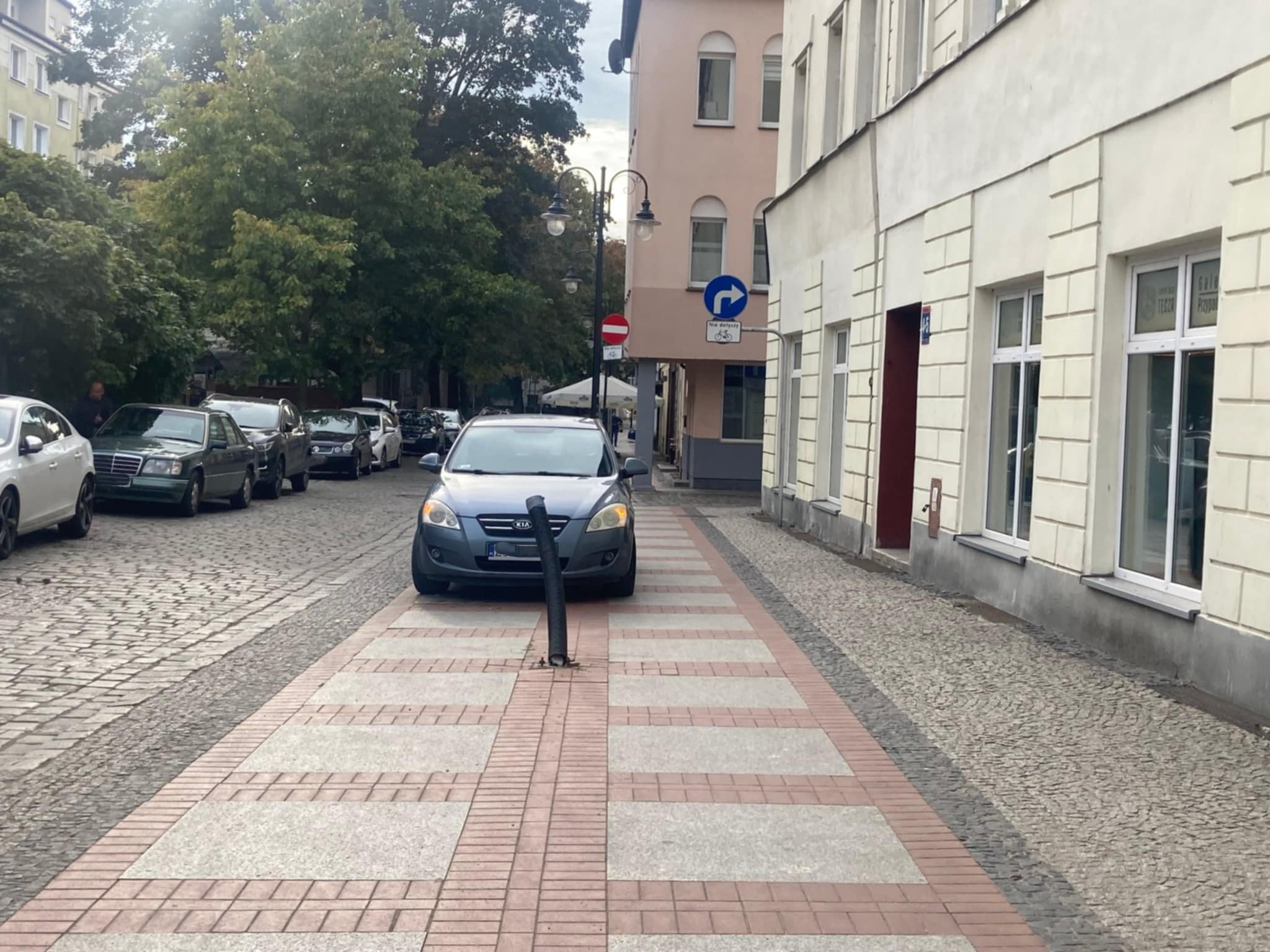 ani zaskakujące, ani nieprzewidywalne. Samochody regularnie wjeżdżają tu na chodnik, jakby granica między przestrzenią dla pieszych a jezdnią była jedynie propozycją interpretacyjną – sugestią, którą można uprzejmie zignorować.
