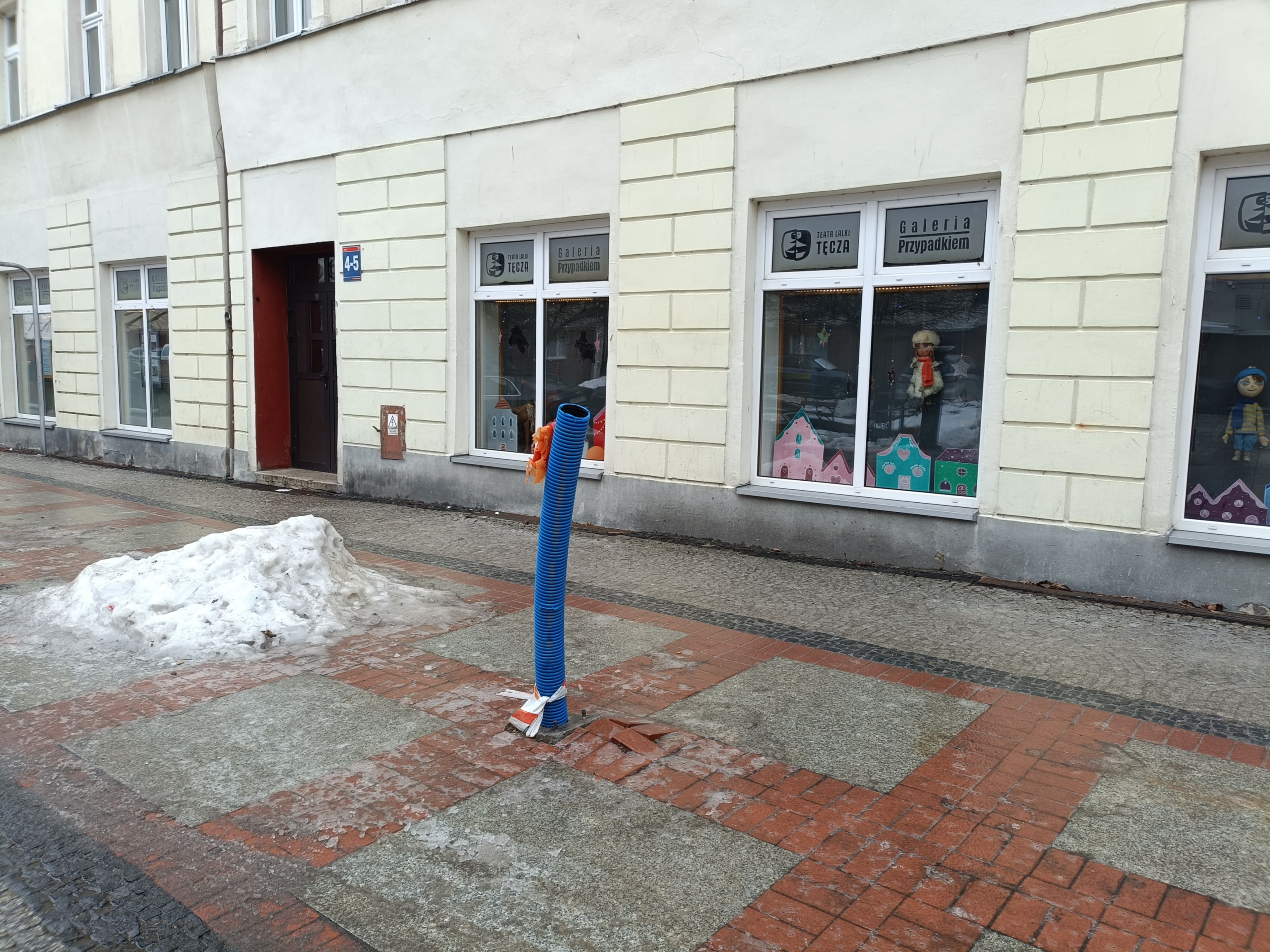 Z okien „Galerii Przypadkiem” patrzą na nie lalki – milczący świadkowie ulicznej rutyny, w której latarnie regularnie sprawdzają swoją odporność na kontakt