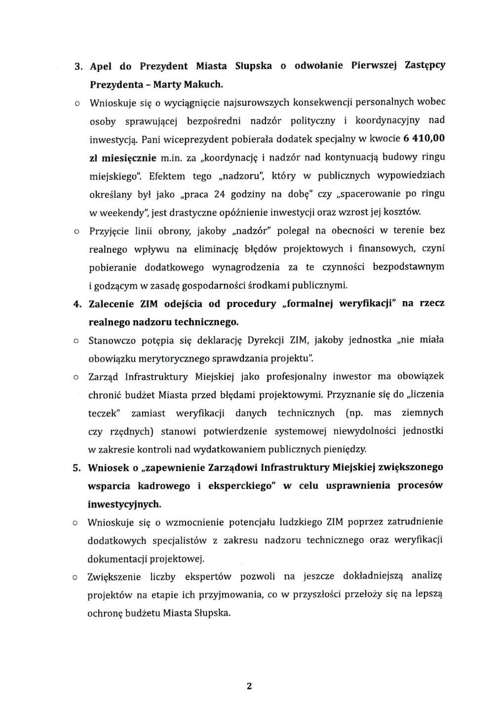 Szczególne emocje wzbudził apel do prezydent miasta o odwołanie pierwszej zastępcy prezydenta, Marty Makuch. W uzasadnieniu wskazano, że to ona sprawowała bezpośredni nadzór polityczny i koordynacyjny nad kontynuacją budowy ringu miejskiego.