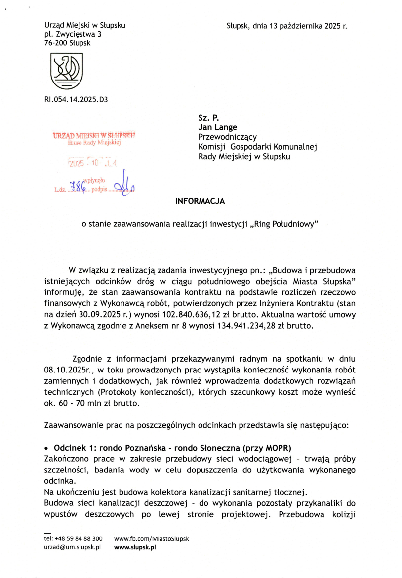 Za niespełna 4,5 kilometra południowego ringu Słupsk zapłaci prawie 200 milionów złotych. Wartość umowy z wykonawcą to 134,9 mln zł, ale w najnowszej informacji przekazanej radnym – raporcie z 13 października 2025 roku – miasto przyznaje, że konieczne są dodatkowe prace za kolejne 60–70 mln zł. Tymczasem na koniec września wykonano niespełna 60 procent inwestycji, której stan rozliczeń wynosi już 102,8 mln zł.