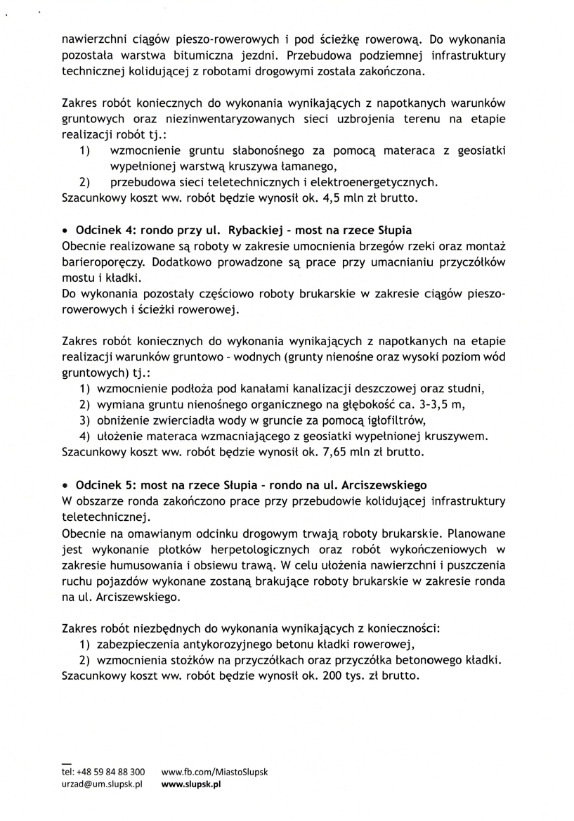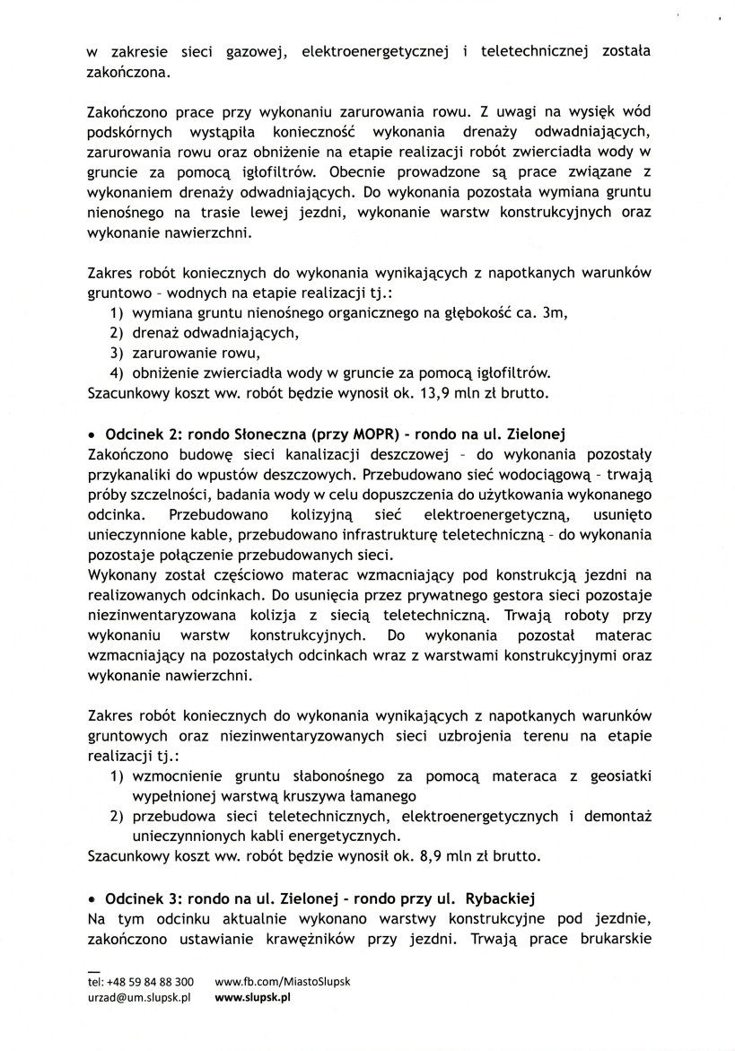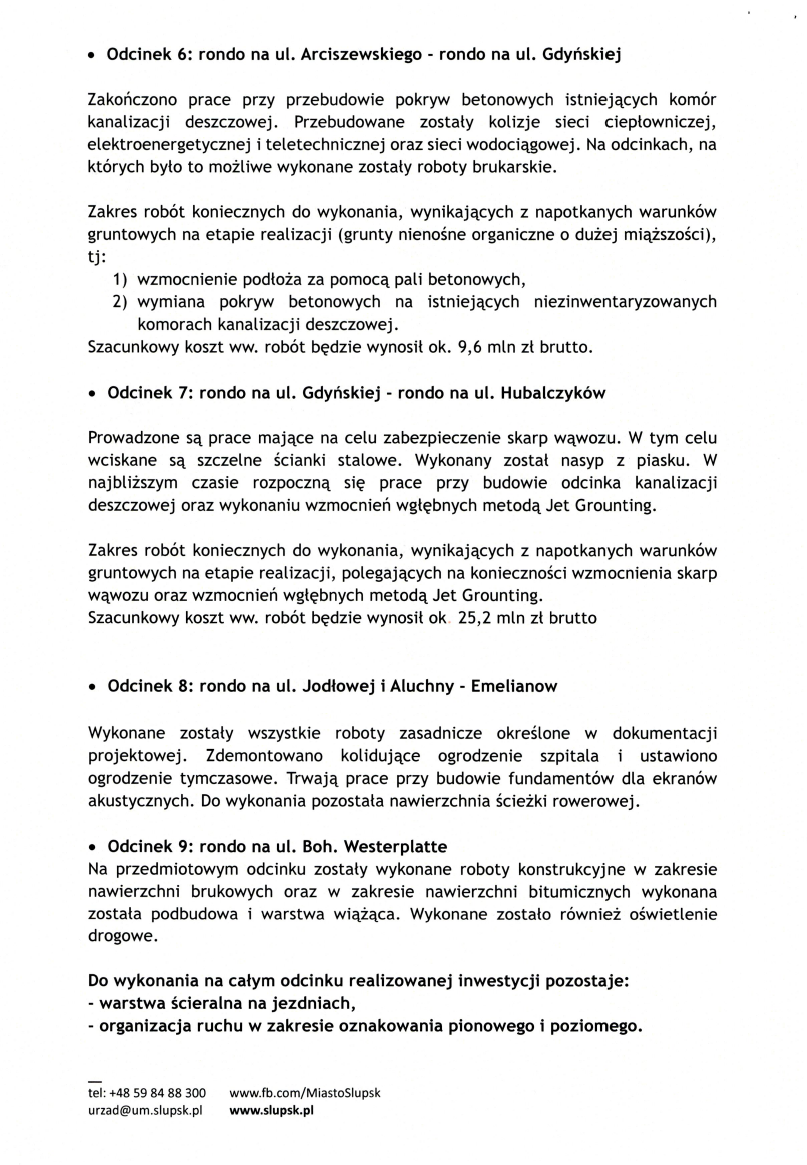 a Gdyńską opisano jako ukończony, choć w rzeczywistości wciąż zieje tam wyrwa, z którą nie wiadomo, co zrobić. Wykonawca planuje w tym miejscu wzmocnienie podłoża za pomocą betonowych pali, co samo w sobie pokazuje skalę problemu. Koszt tych „zakończonych” robót – blisko 10 milionów złotych. Dla dwóch ostatnich odcinków nie podano natomiast żadnej wyceny, jakby końcówka drogi wciąż istniała tylko na papierze.