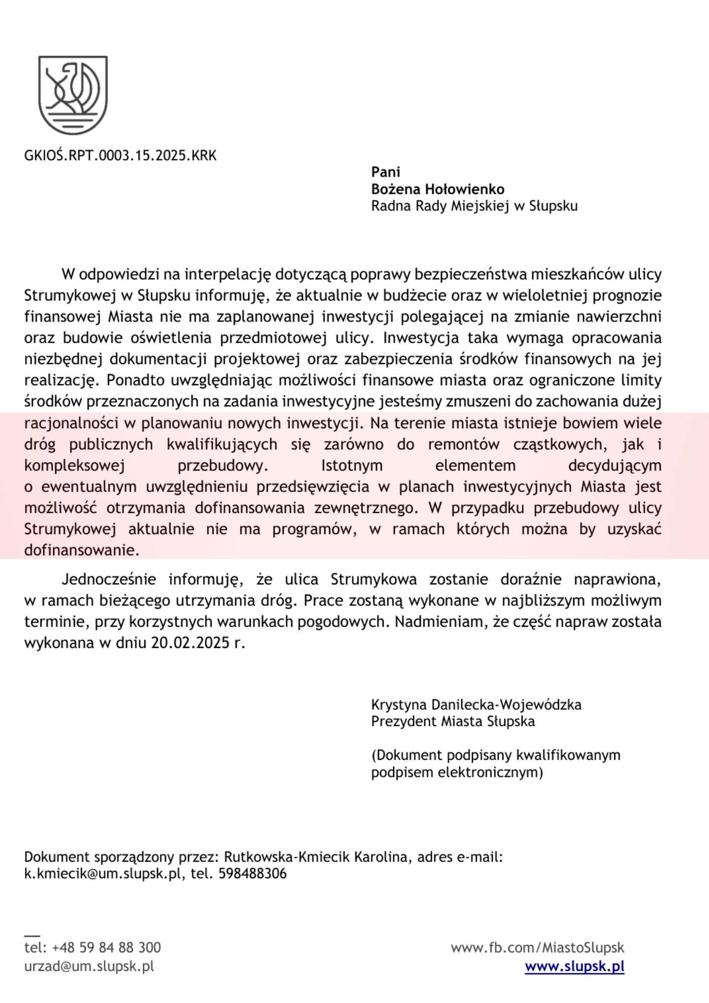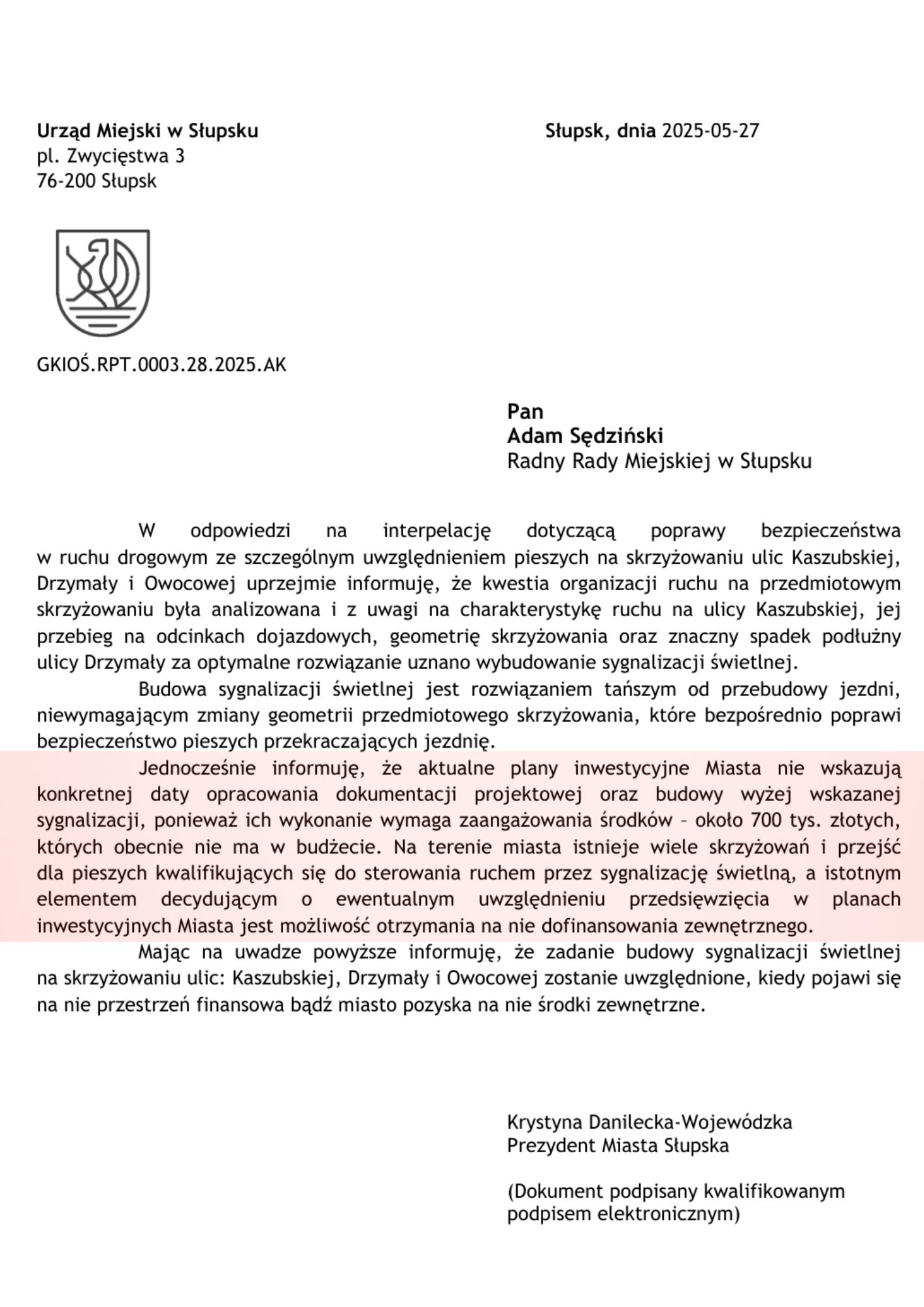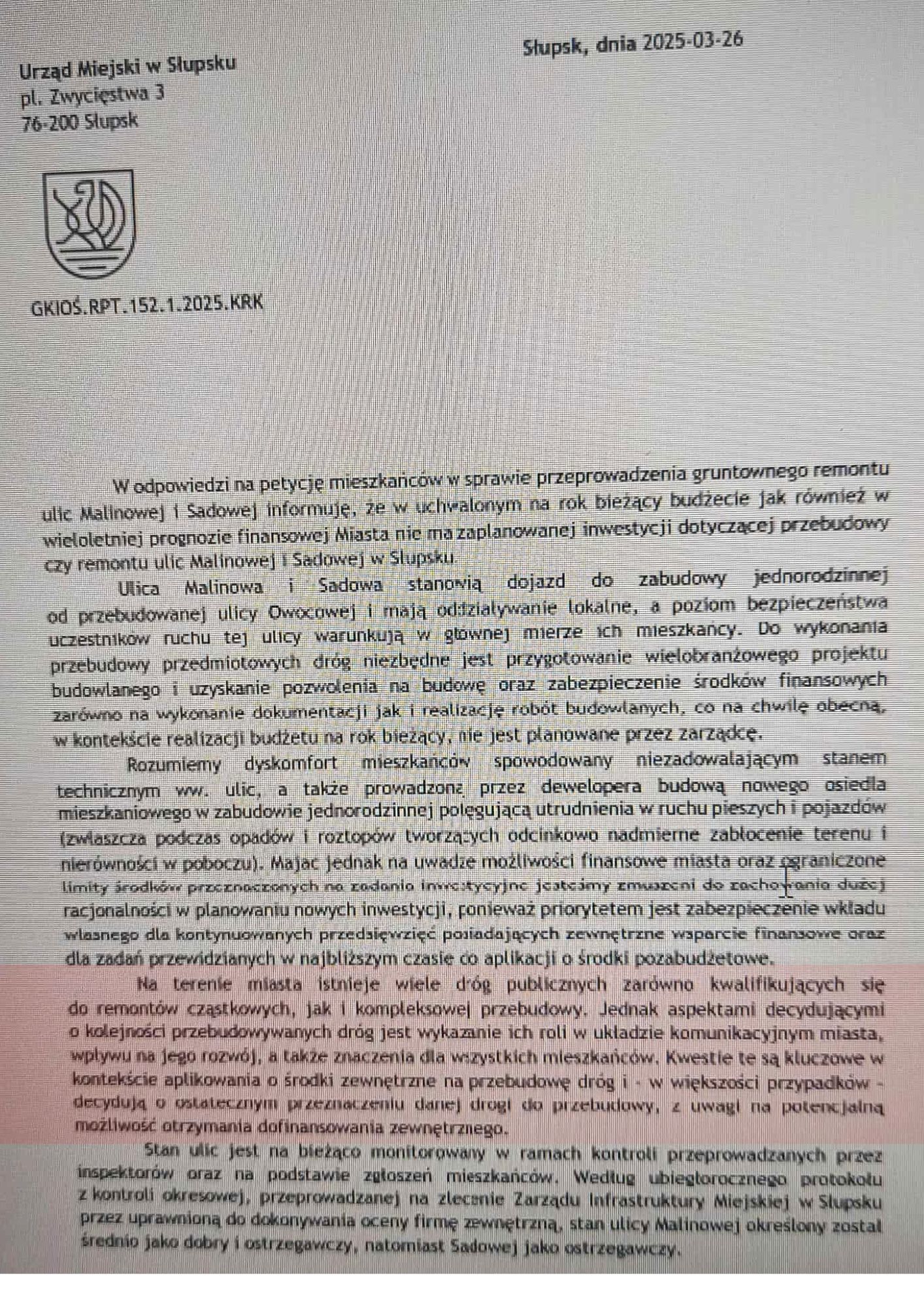 Z niezmienną konsekwencją od kilkudziesięciu lat władze Słupska powtarzają tę samą mantrę: o braku środków, o konieczności przygotowania dokumentacji, o oczekiwaniu na zewnętrzne dofinansowanie. Mamy więc niepowtarzalną okazję obserwować, jak historia zatacza koło – rok w rok jesteśmy pomijani przy ustalaniu budżetu, a w zamian dostajemy identyczne odpowiedzi, często żywcem kopiowane z poprzednich pism.