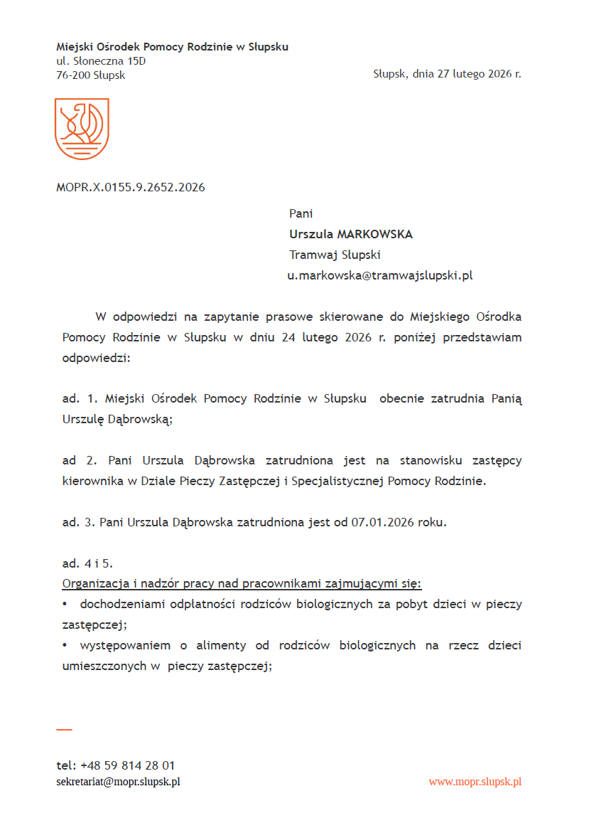 Informację o zatrudnieniu potwierdza oficjalna odpowiedź Miejskiego Ośrodka Pomocy Rodzinie w Słupsku z 27 lutego 2026 roku. W piśmie skierowanym do redakcji czytamy wprost, że MOPR „obecnie zatrudnia Panią Urszulę Dąbrowską”, a od 7 stycznia 2026 roku pełni ona funkcję zastępcy kierownika Działu Pieczy Zastępczej